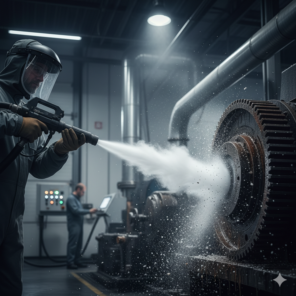 - 💨 Sublimação Instantânea: O Gelo Seco passa diretamente do estado sólido para o gasoso (sublimação), não deixando nenhum resíduo secundário (como areia ou água). Isso reduz o tempo de inatividade e os custos de descarte de resíduos.